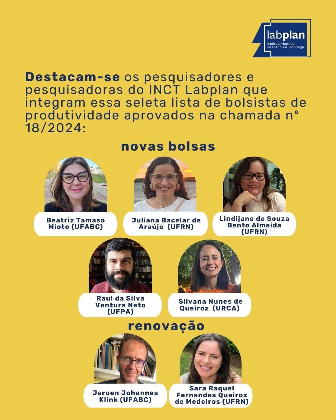 Foram aprovados, ao todo, 6.057 bolsistas: 5.623 em Produtividade em Pesquisa (PQ, correspondente a 40% da demanda). Destacam-se os pesquisadores e pesquisadoras do INCT Labplan que integram essa seleta lista de bolsistas de produtividade: Beatriz Tamaso Mioto (UFABC), Jeroen Johannes Klink (UFABC- renovação), Juliana Bacelar de Araújo (UFRN), Lindijane de Souza Bento Almeida (UFRN), Raul da Silva Ventura Neto (UFPA), Sara Raquel Fernandes Queiroz de Medeiros (UFRN - renovação) e Silvana Nunes de Queiroz (URCA).